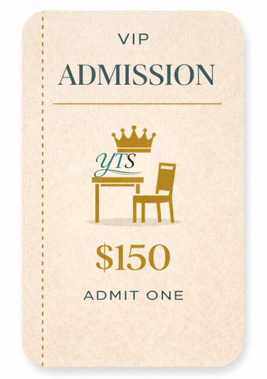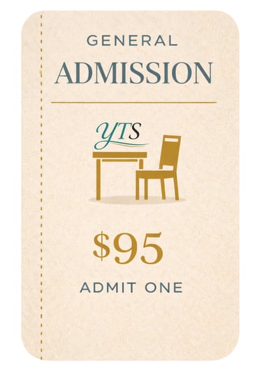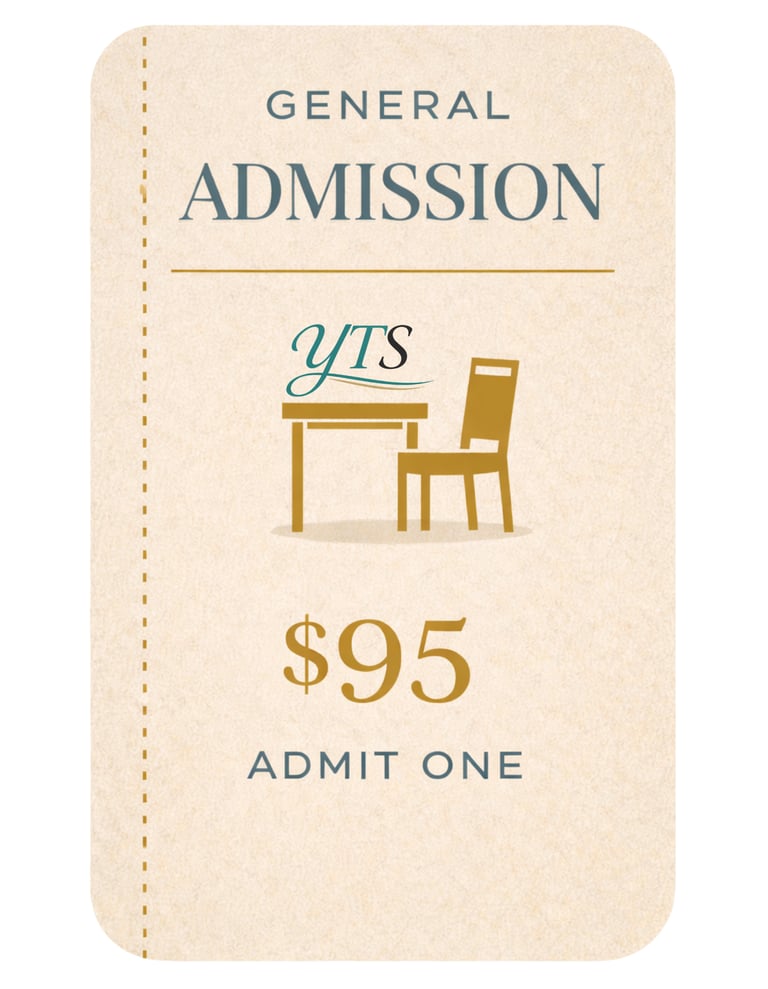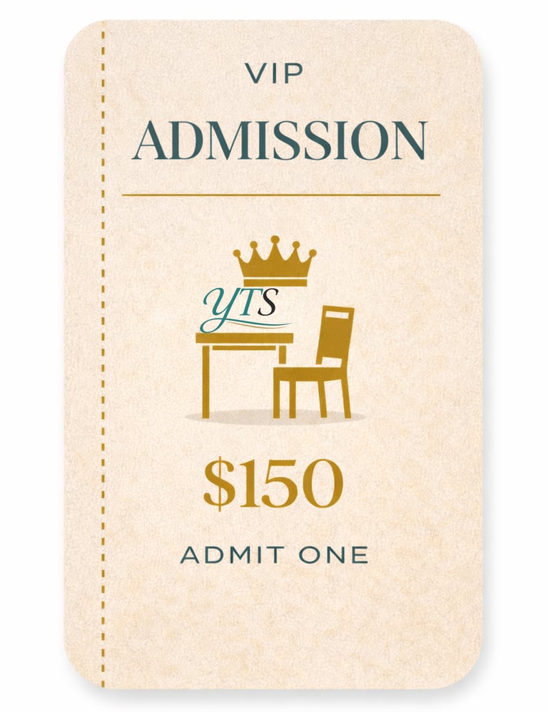 Includes premium seating, a private 30-minute post-workshop strategy call, a limited-run Your Table Society T-shirt, and a notebook, pen set an tumbler.